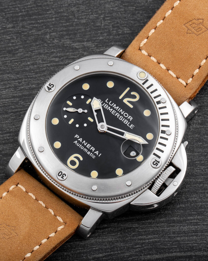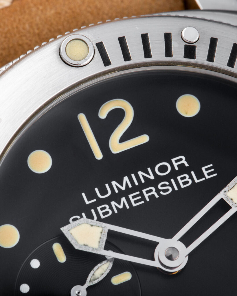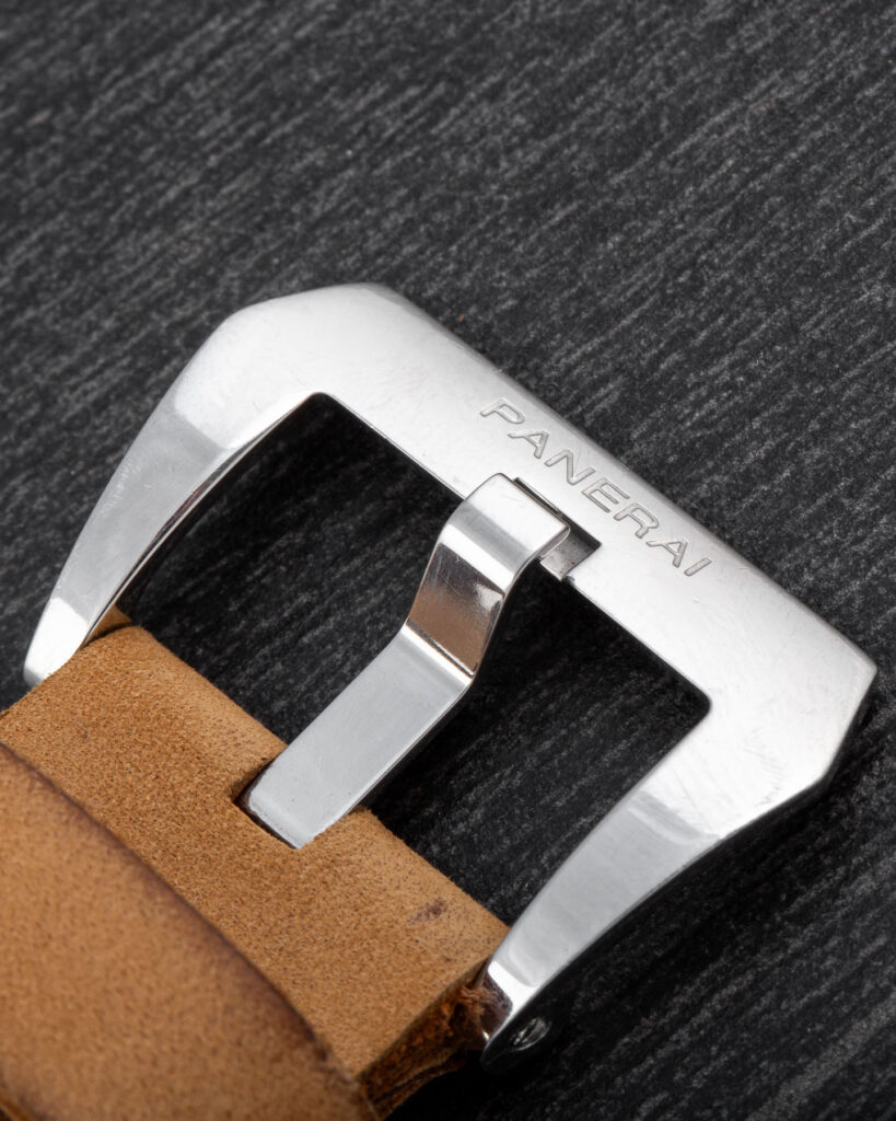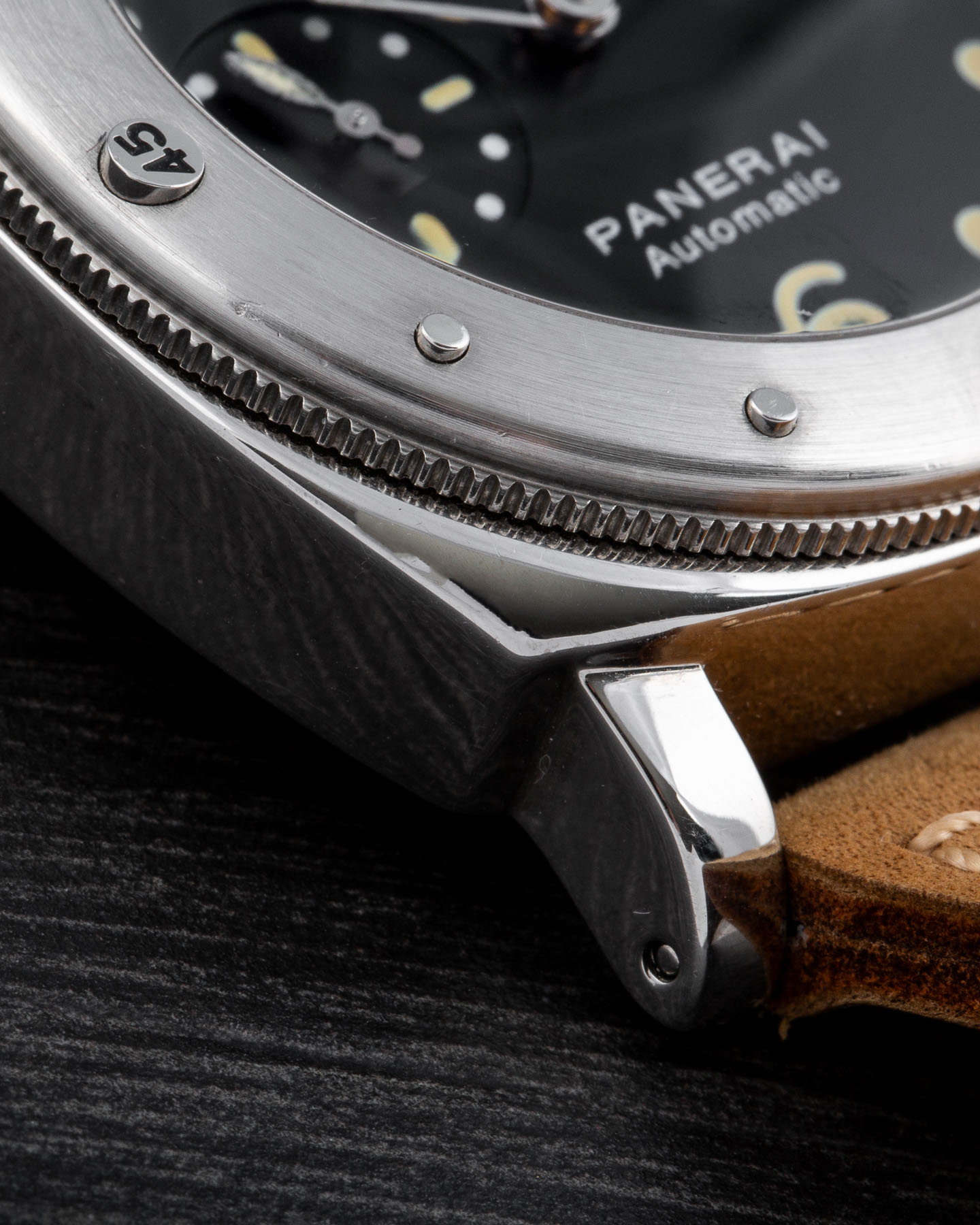 It is a Panerai of rare beauty, especially when found in this configuration with a tritium dial. Produced in only 2,500 pieces, just a small number were fitted with tritium dials; later examples feature Luminova dials, much whiter and lacking the warm yellow patina that tritium develops over time — a key element of this watch’s charm.