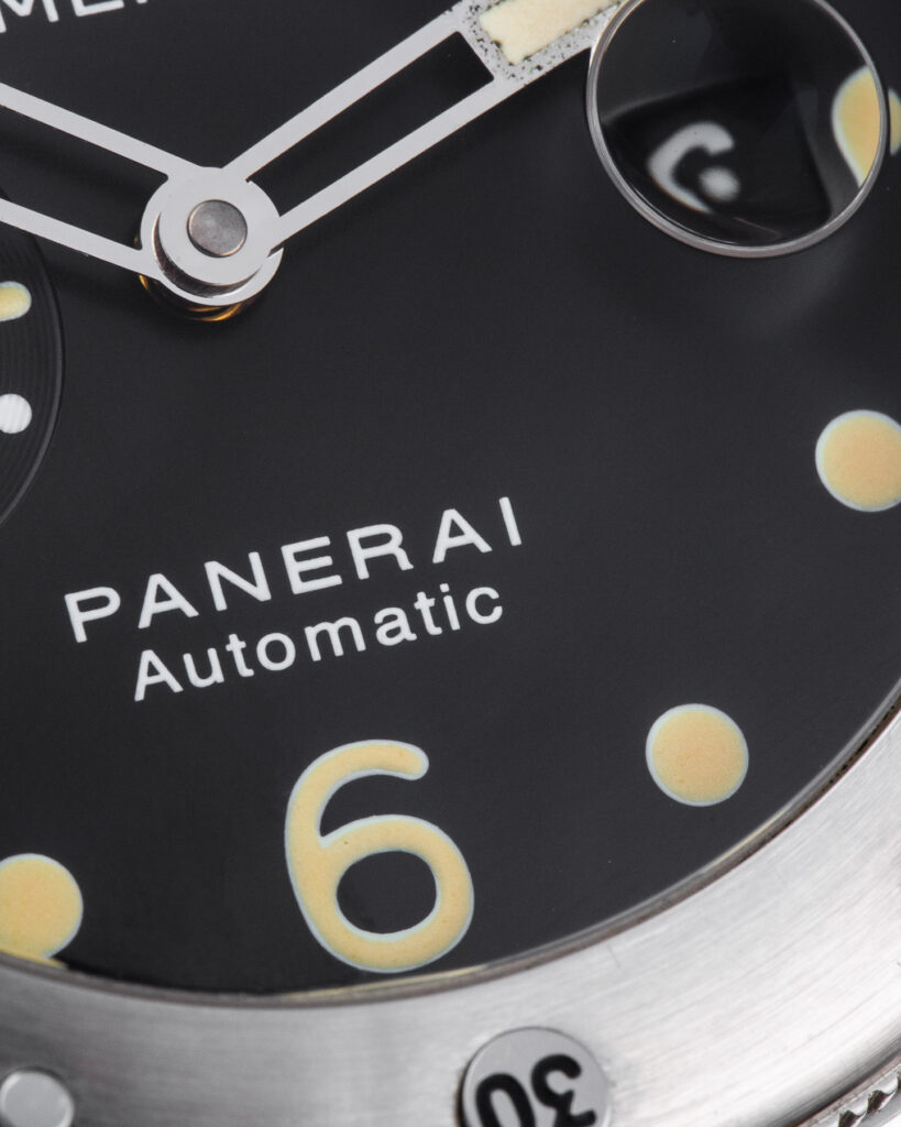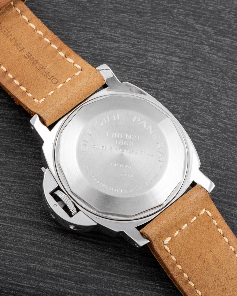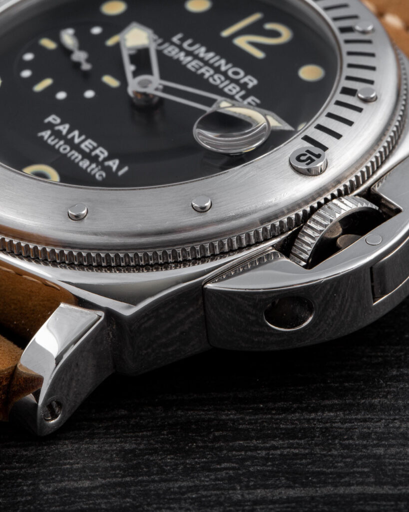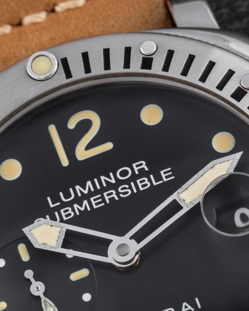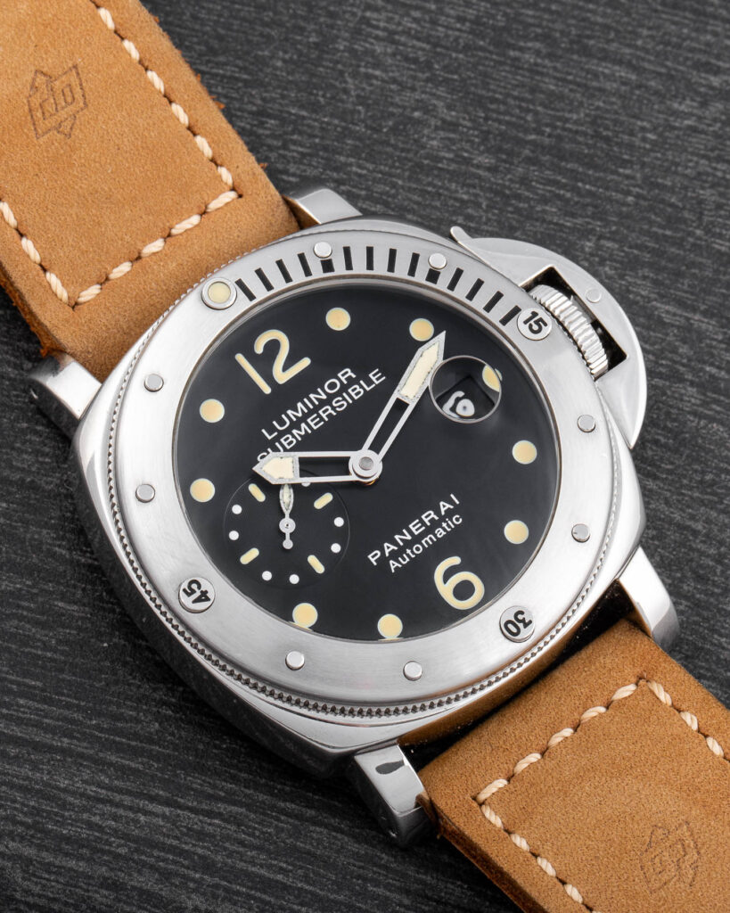 It is a Panerai of rare beauty, especially when found in this configuration with a tritium dial. Produced in only 2,500 pieces, just a small number were fitted with tritium dials; later examples feature Luminova dials, much whiter and lacking the warm yellow patina that tritium develops over time — a key element of this watch’s charm.