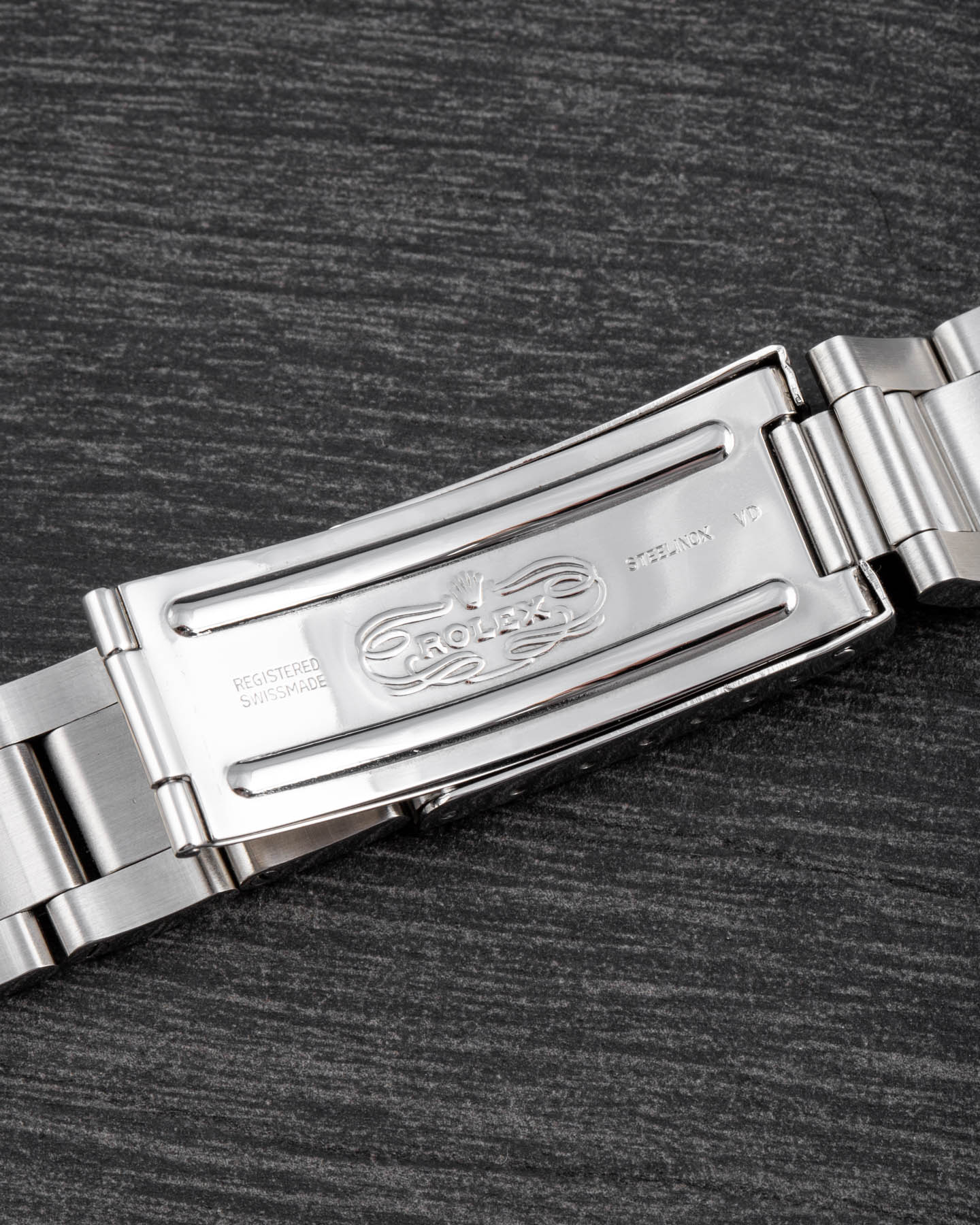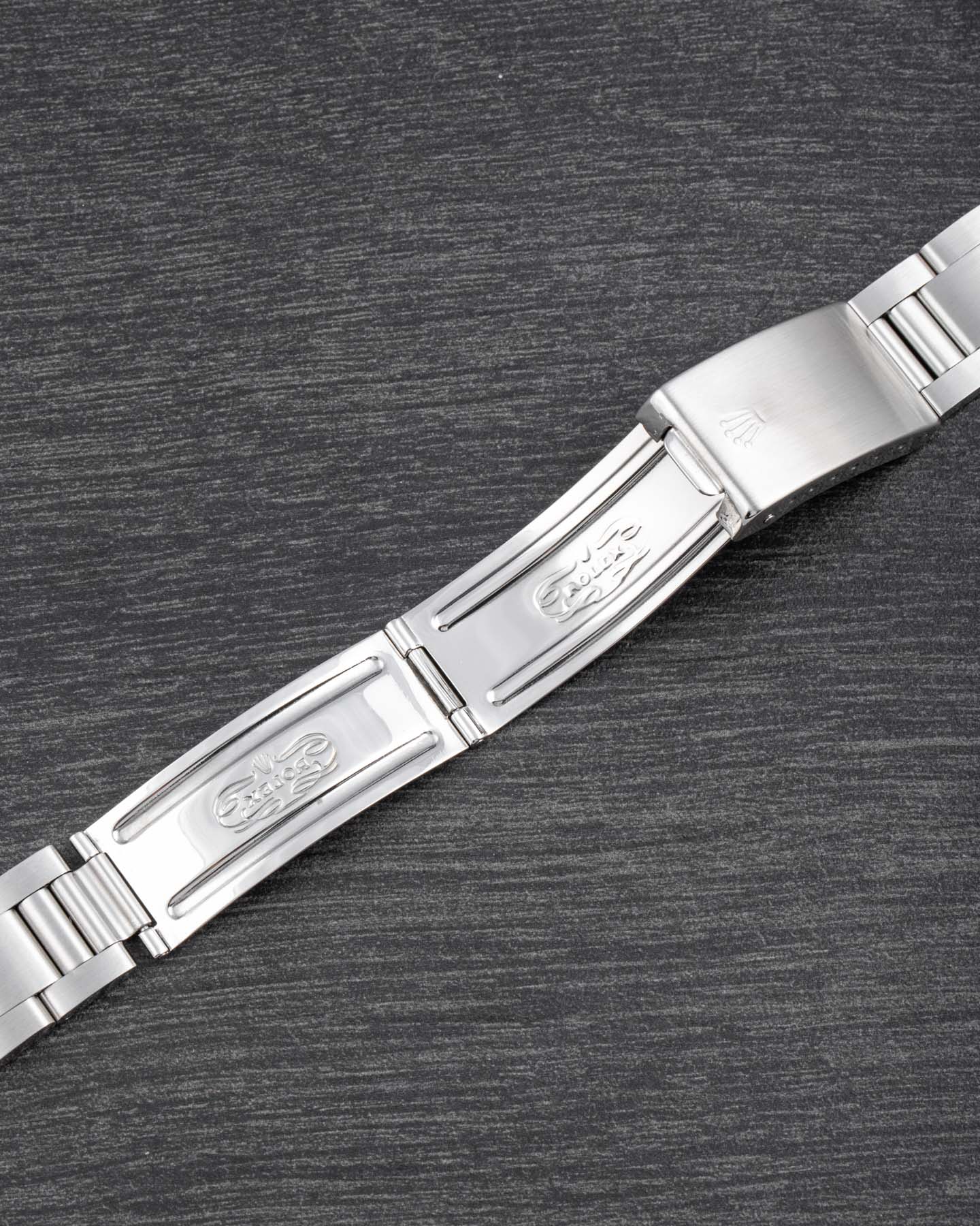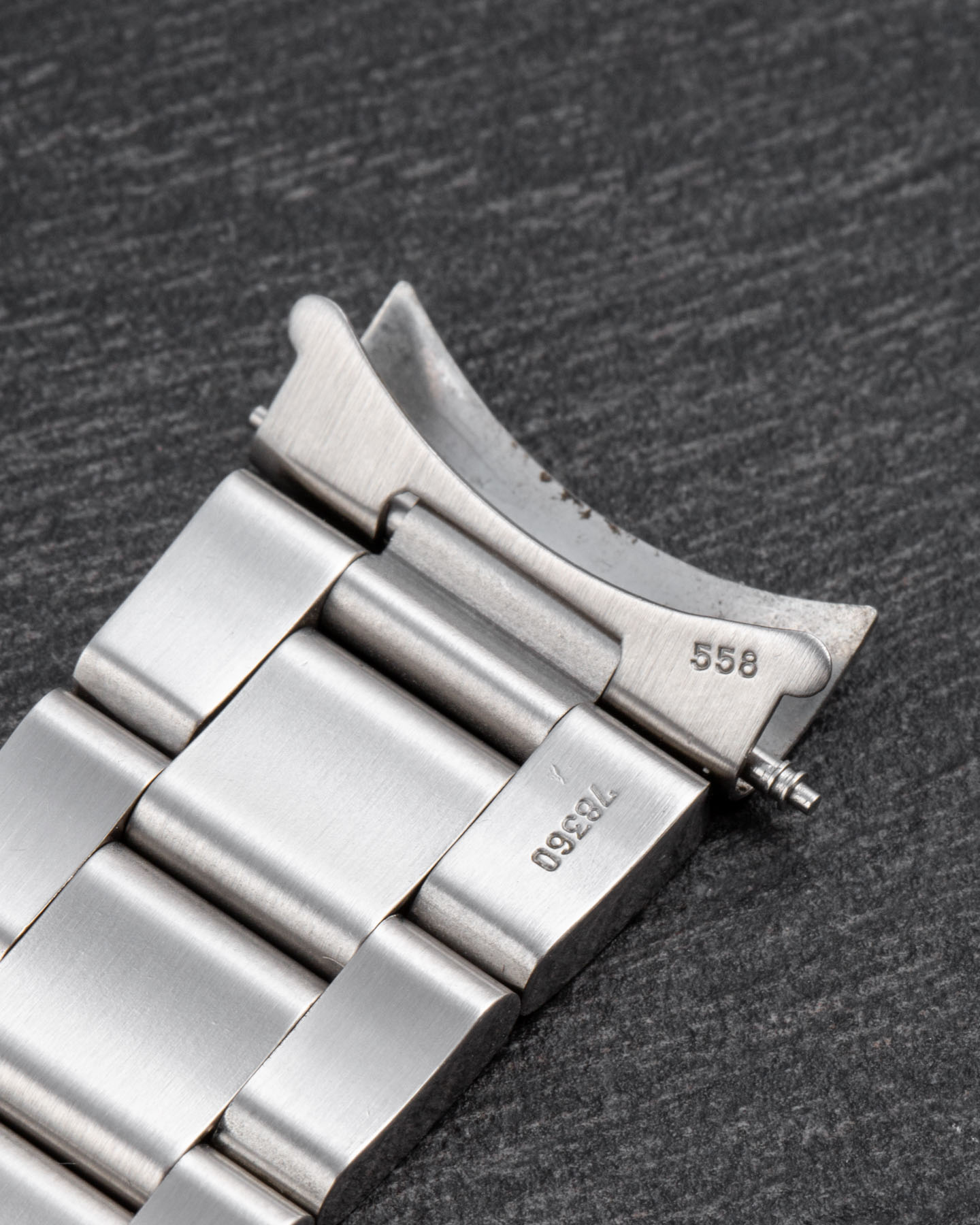 All components are period-correct: T Swiss T dial with tritium indexes and hands, steel engine-turned bezel, caliber 1570 movement, caseback signed 1601, and bracelet 78360 V6 with 558 end links.
