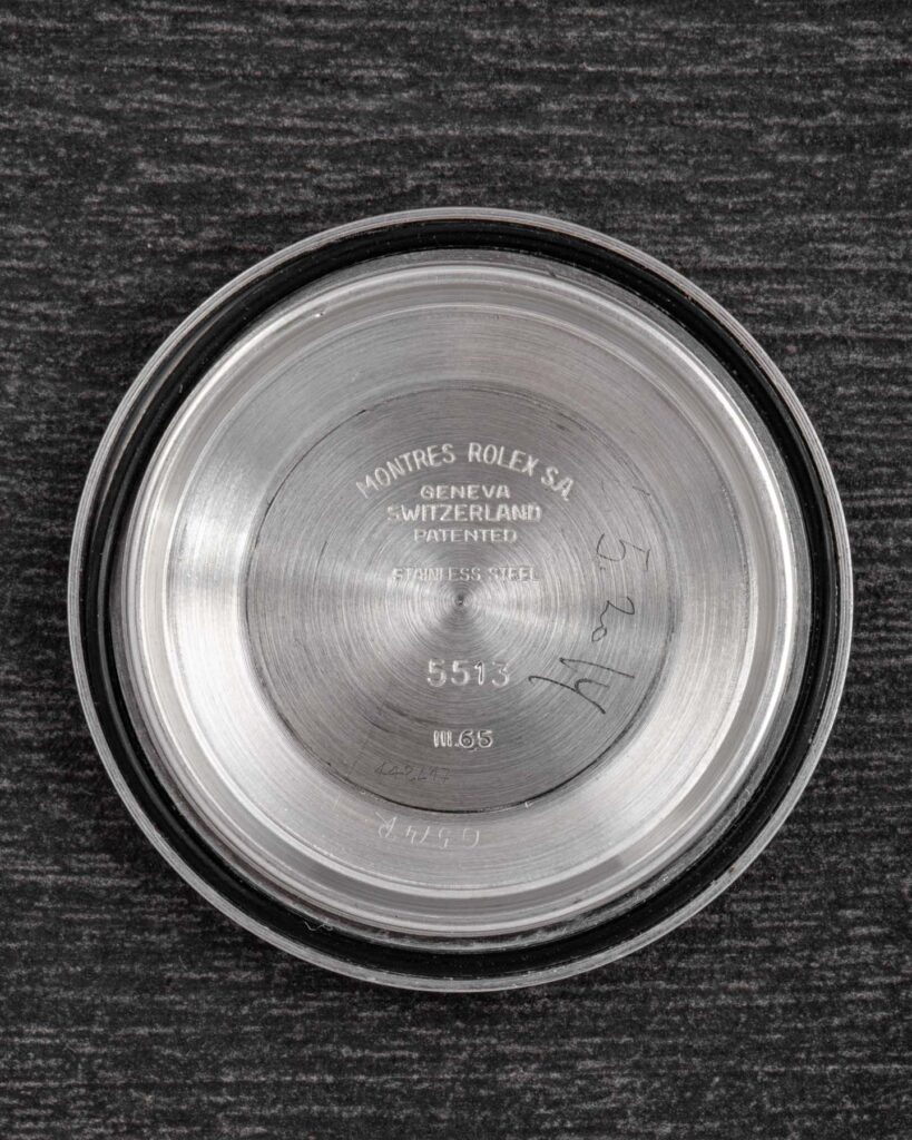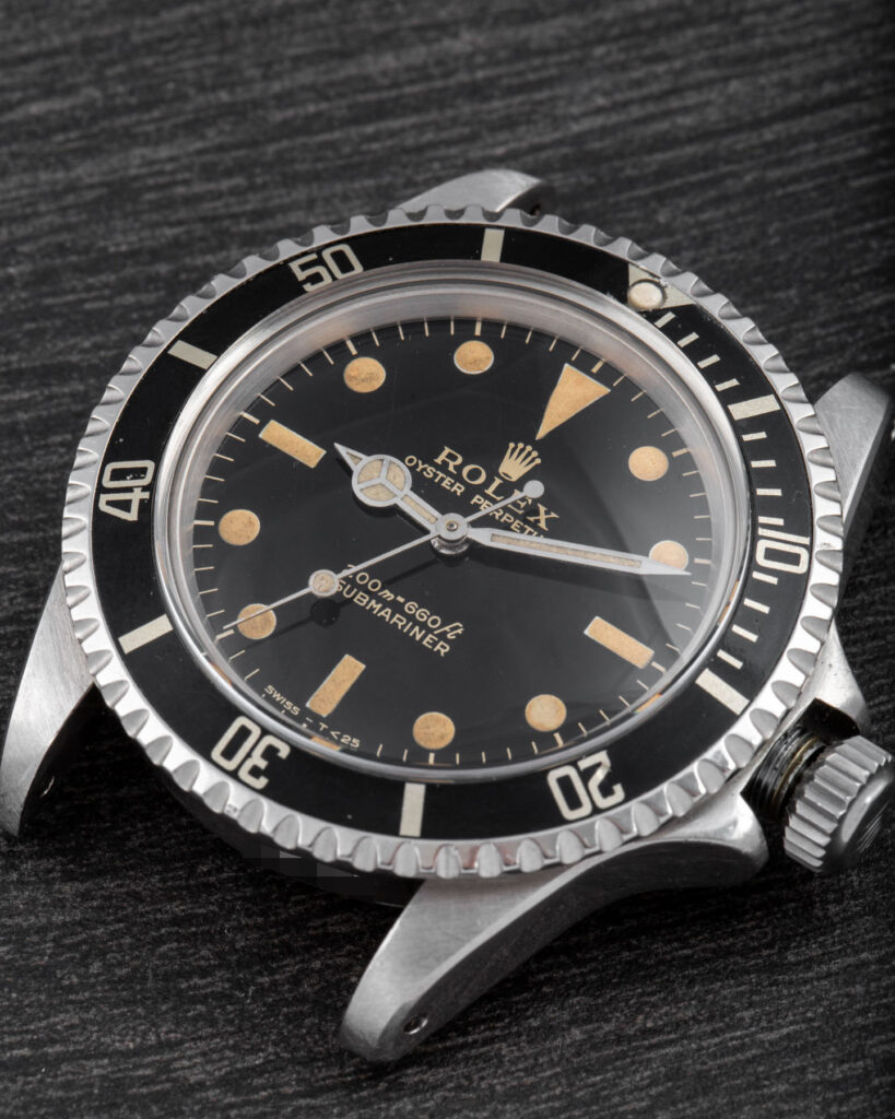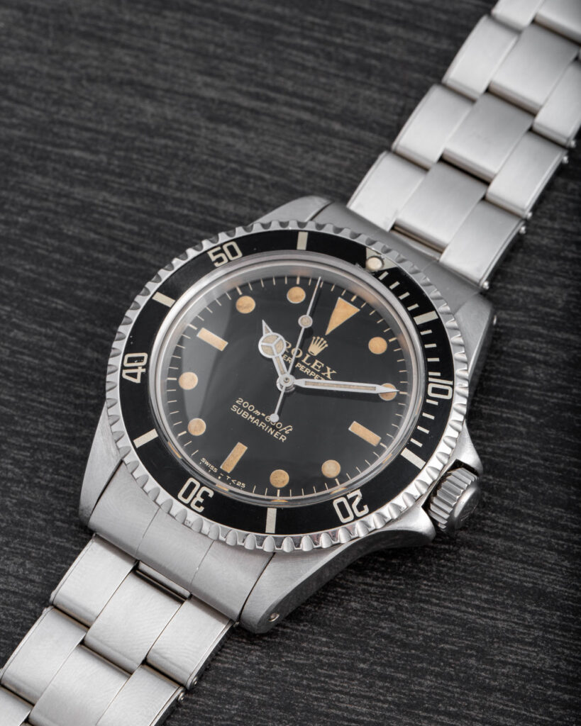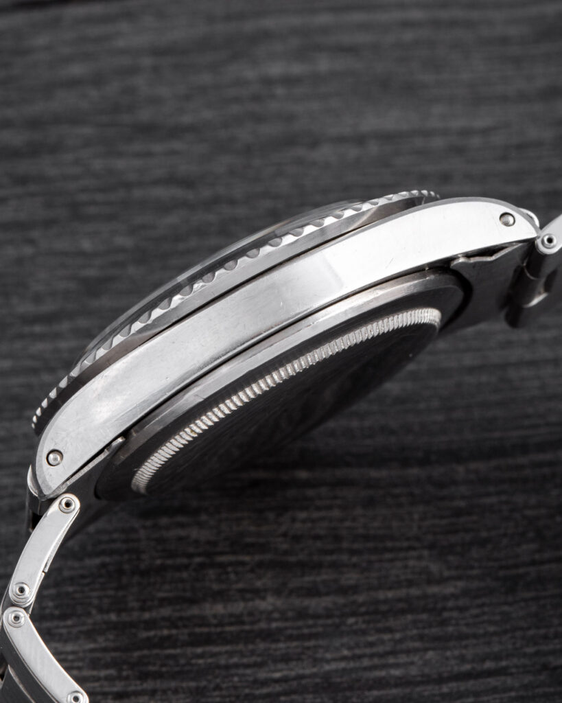 The Rolex Submariner 5513 with gilt dial represents one of the most iconic and desirable versions of the model. Produced during the 1960s, these early examples feature glossy black dials with gilt-gold printing and a mirror-like finish that gives them exceptional depth and warmth under the light. The combination of the glossy surface and the gold text makes these watches particularly sought after by collectors. Their rarity and distinctive aesthetic make them true cornerstones in the evolution of the Submariner line. The more mirror-like and well-preserved the dial, the higher its value.