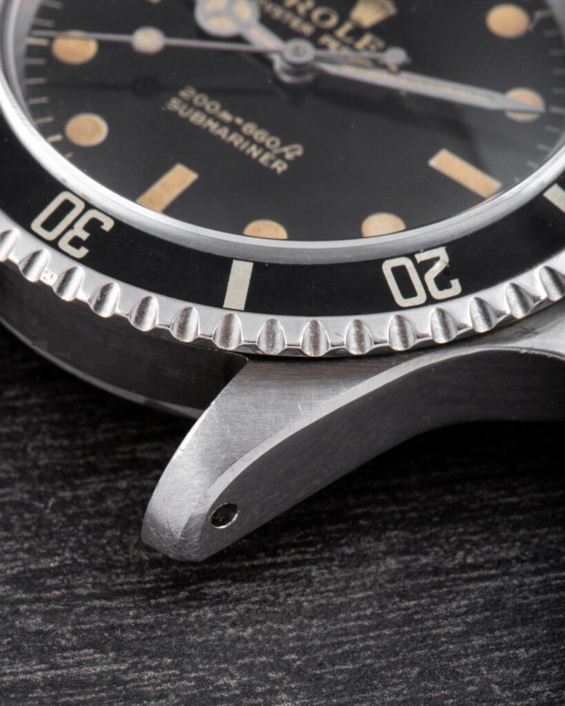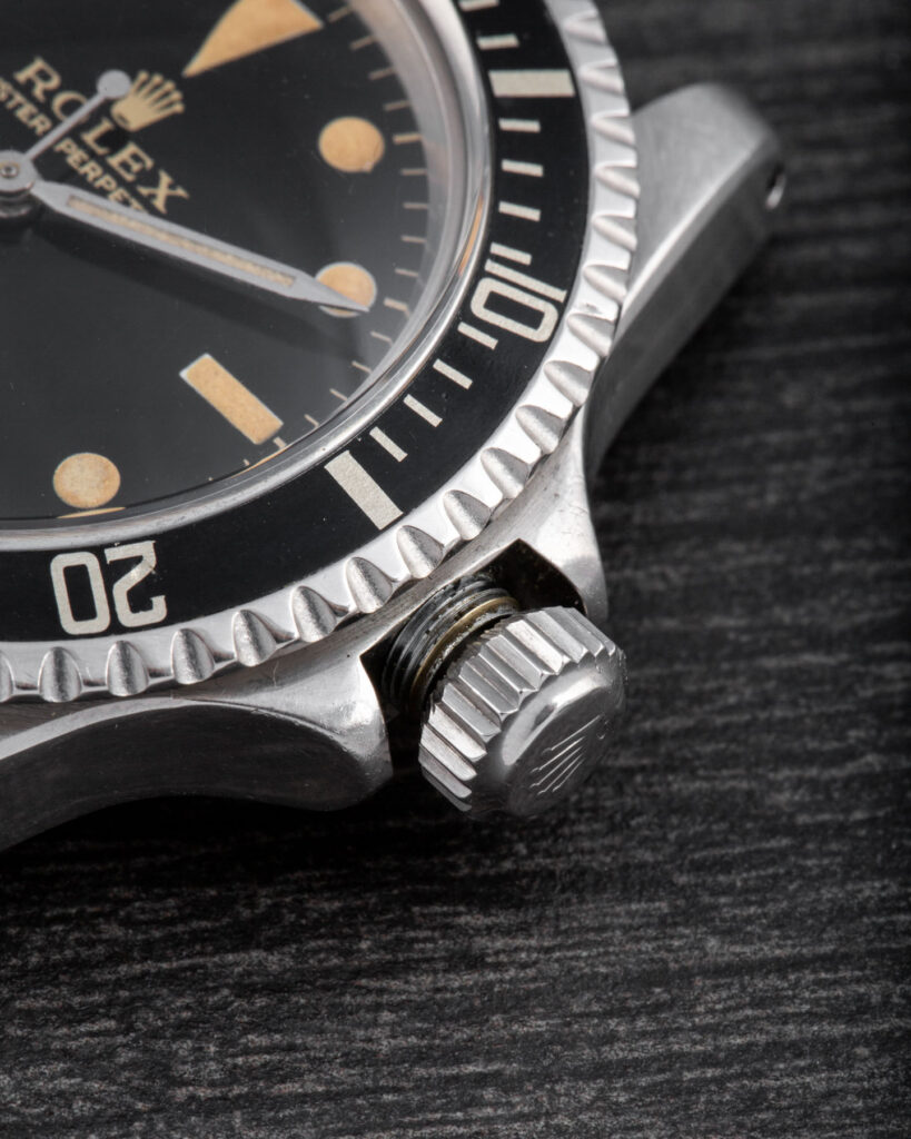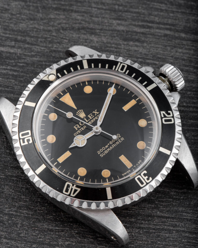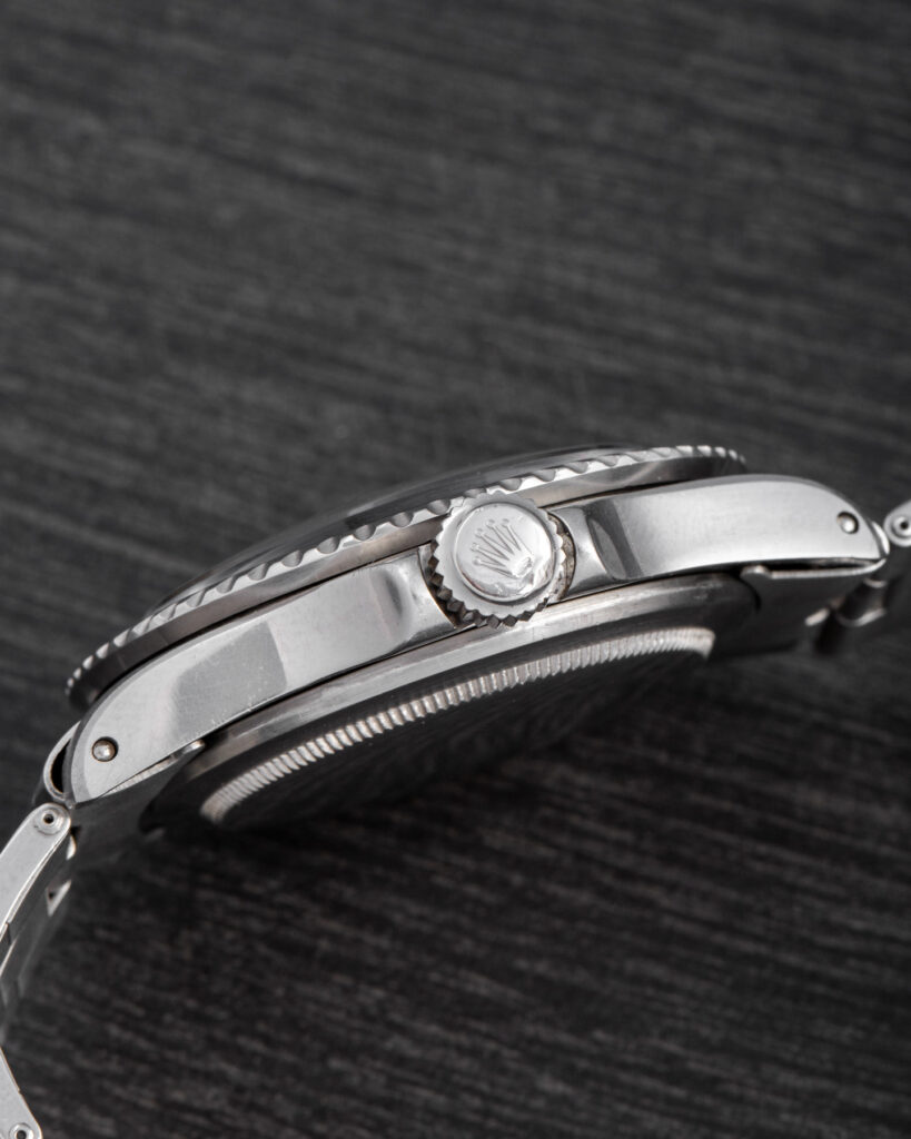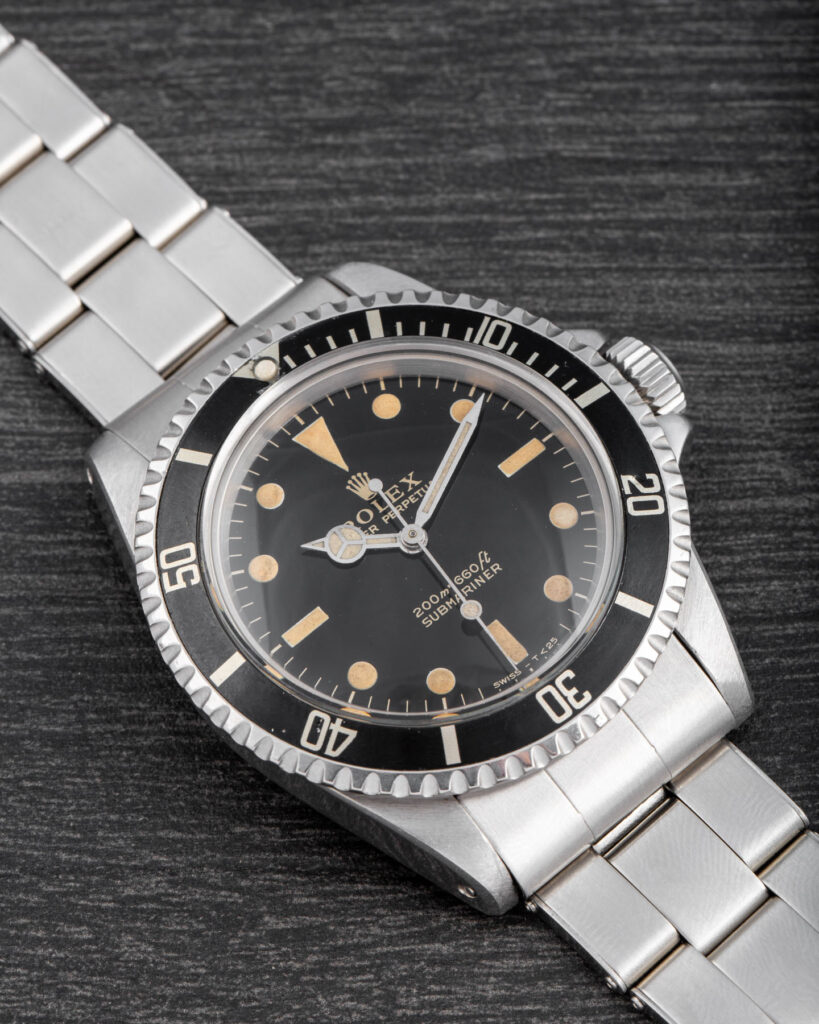 The Rolex Submariner 5513 with gilt dial represents one of the most iconic and desirable versions of the model. Produced during the 1960s, these early examples feature glossy black dials with gilt-gold printing and a mirror-like finish that gives them exceptional depth and warmth under the light. The combination of the glossy surface and the gold text makes these watches particularly sought after by collectors. Their rarity and distinctive aesthetic make them true cornerstones in the evolution of the Submariner line. The more mirror-like and well-preserved the dial, the higher its value.