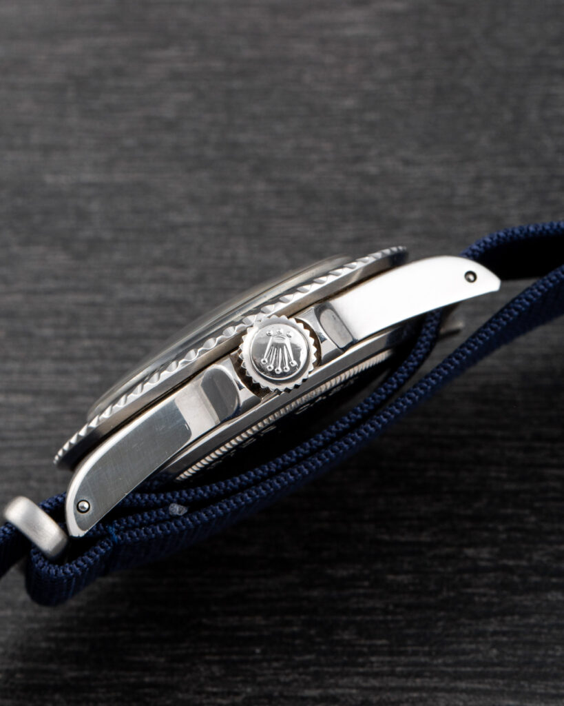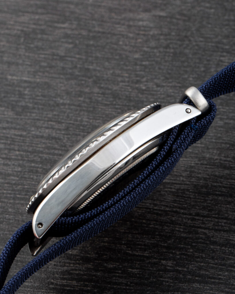 This particular example features a dial with round “dot” indexes and Mercedes hands, characteristics typical of the last versions delivered to the Marine Nationale, replacing the earlier “Snowflake” configuration.