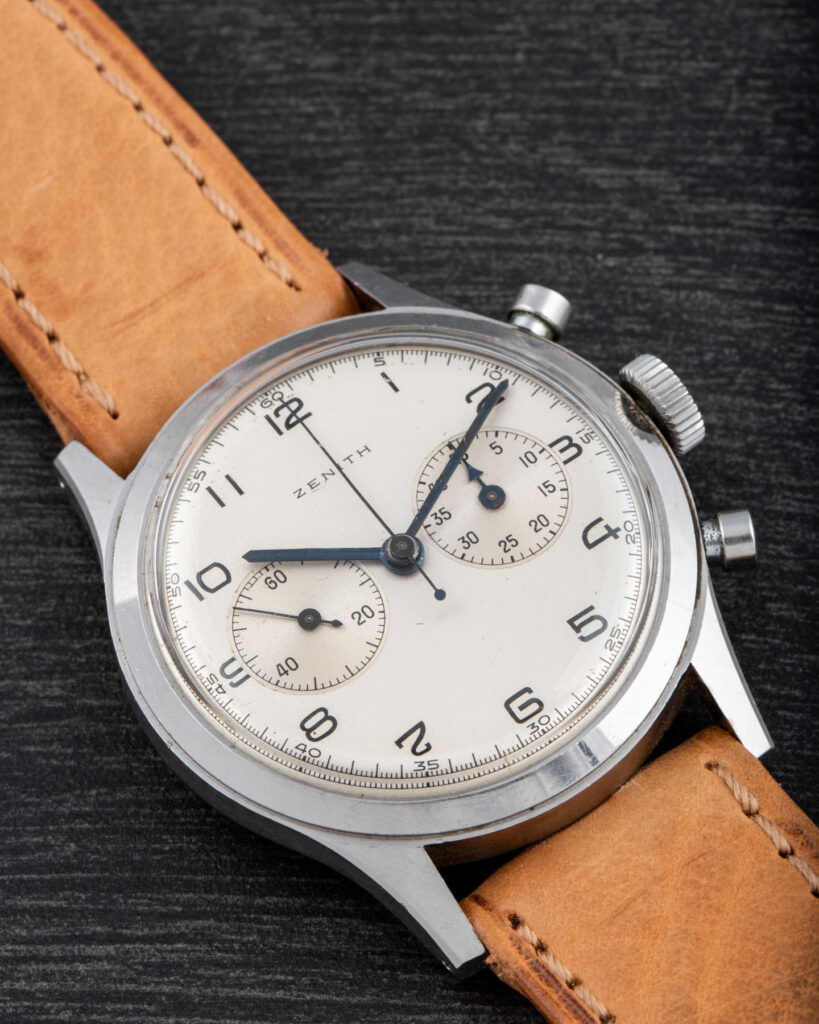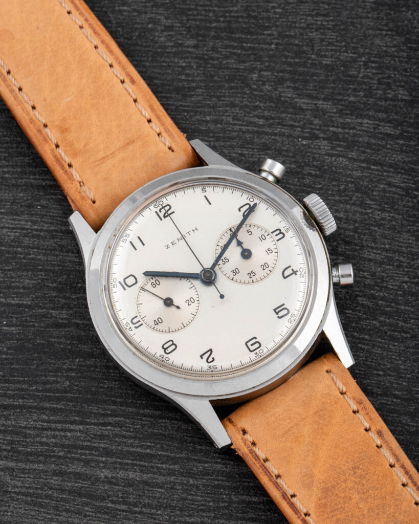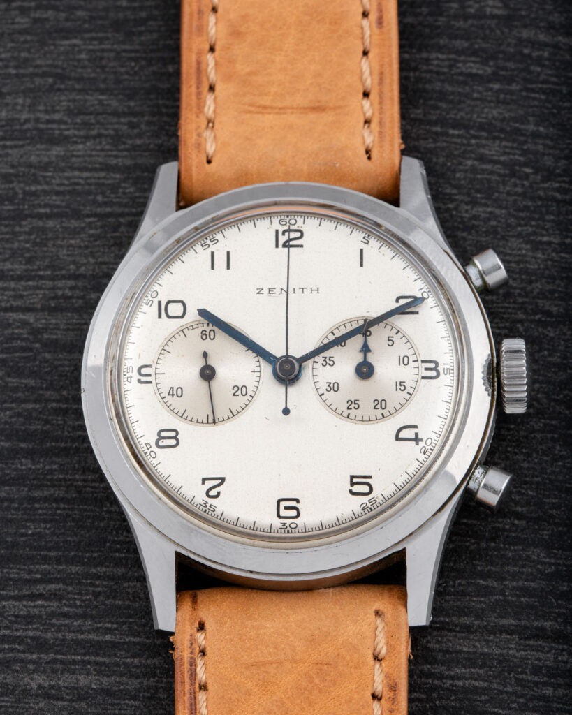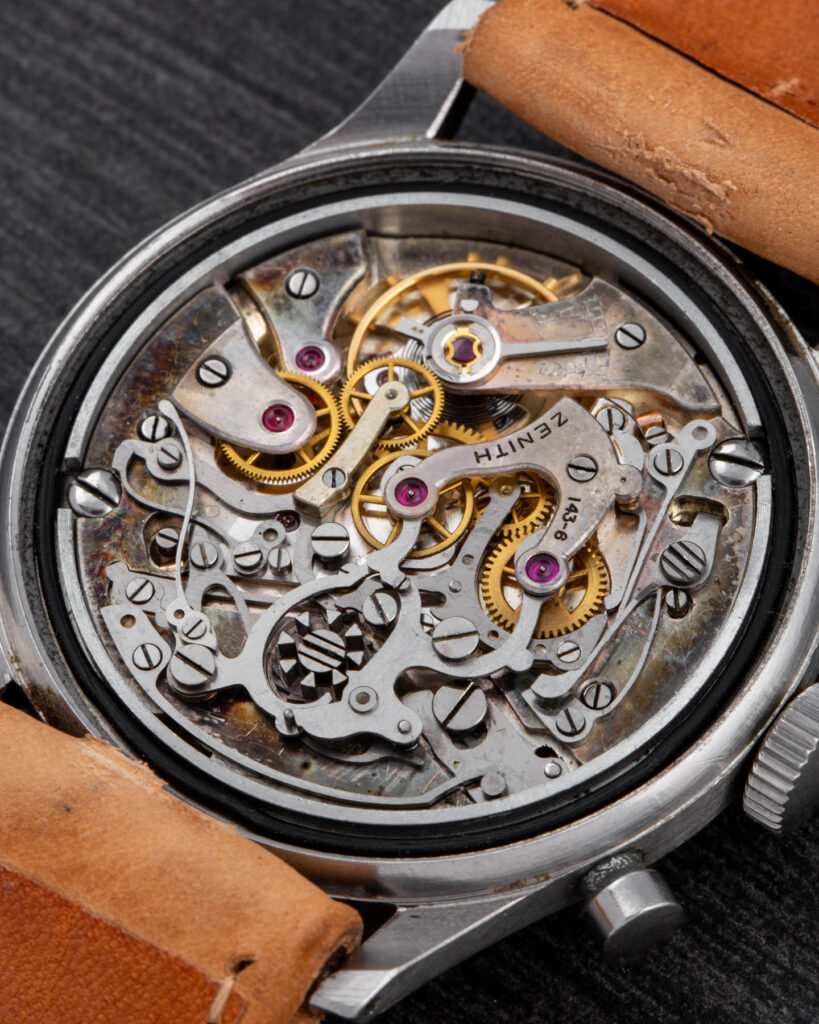 This Zenith is a beautifully crafted oversize chronograph featuring a screw-down caseback, pump pushers, and a magnificent Zenith movement based on the Excelsior Park 143-6 column-wheel caliber.
