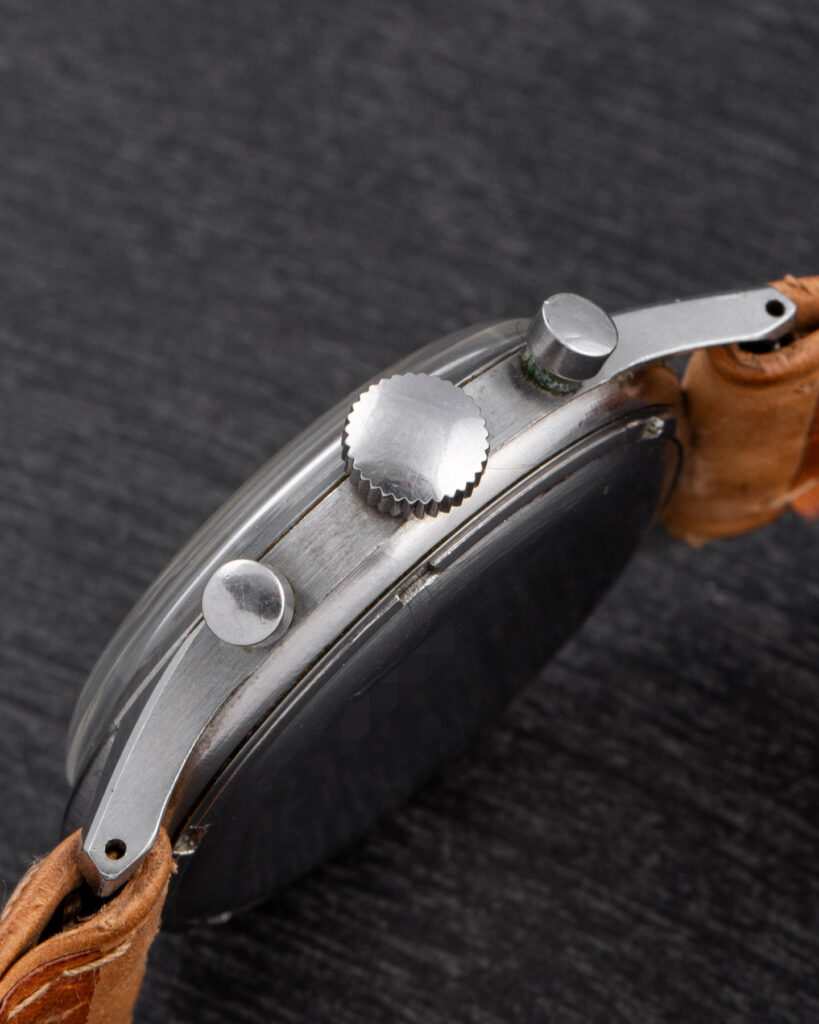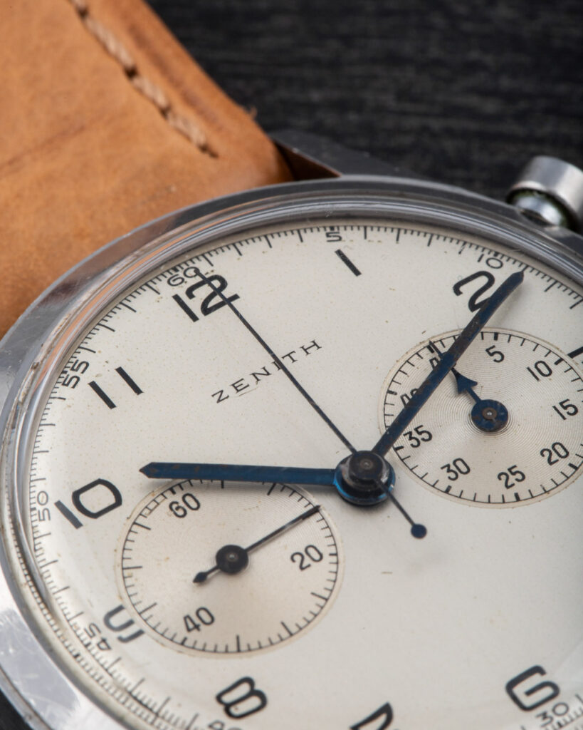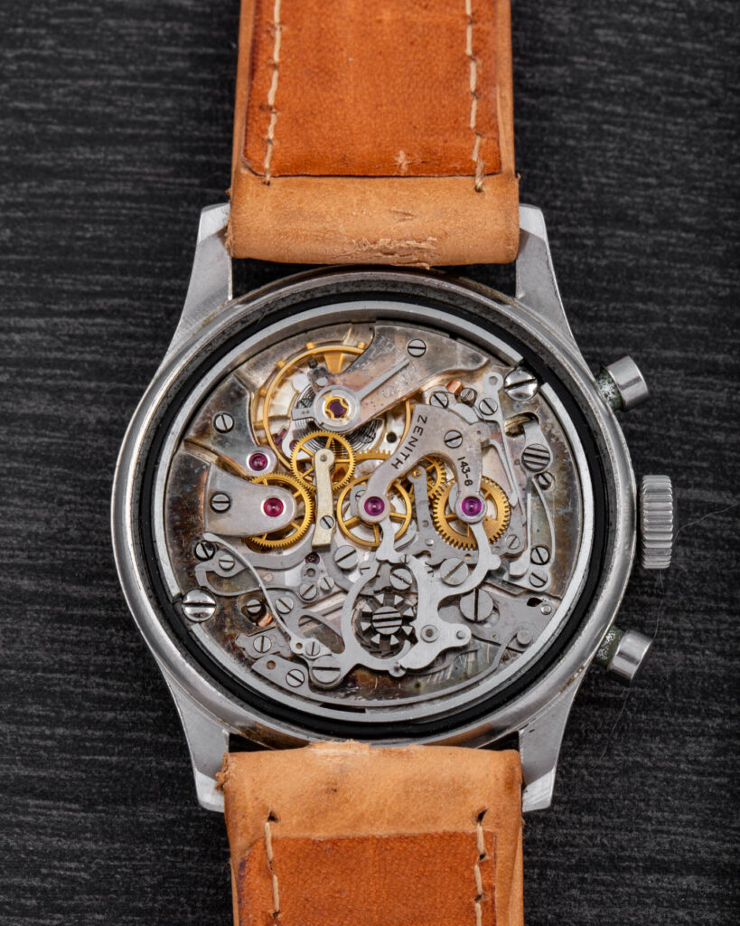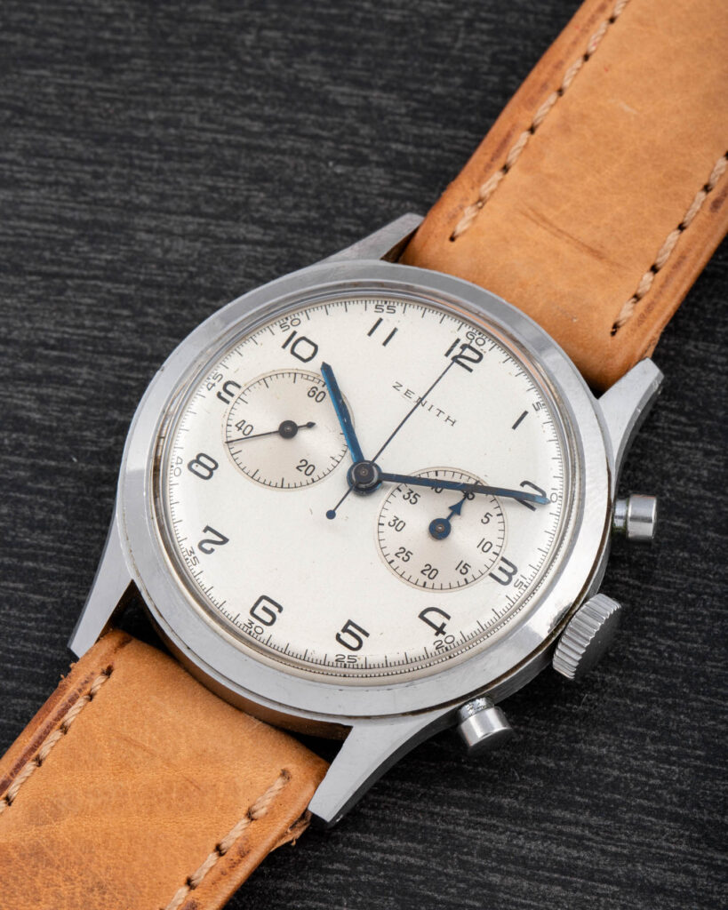 This Zenith is a beautifully crafted oversize chronograph featuring a screw-down caseback, pump pushers, and a magnificent Zenith movement based on the Excelsior Park 143-6 column-wheel caliber.